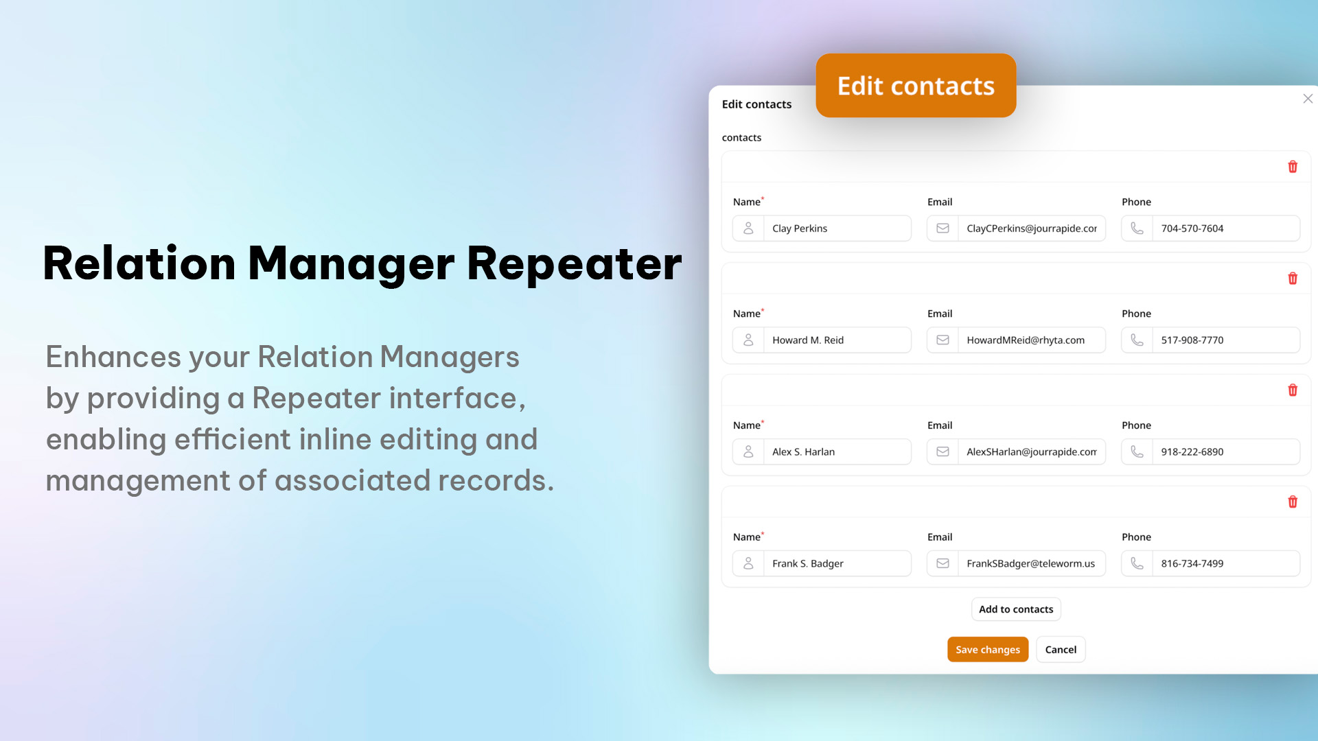 The plugin creates a modal with a repeater component that loads all related records. When you save the form: