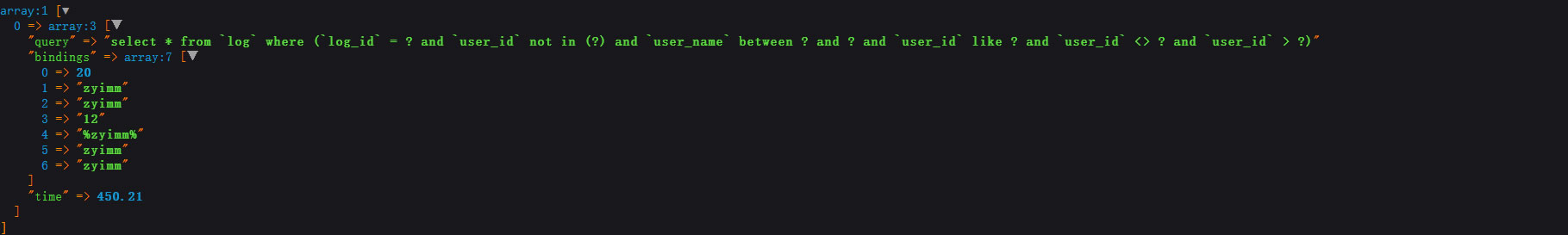 /** *目前支持条件操作符 '=', '<>', '>', '>=', '<', '<=', 'like', 'full_like', 'in', 'not_in', 'between', 'not_between' **/ use Illuminate\Support\Facades\DB; use zyimm\query\build\QueryWhere; /** * @var QueryWhere $build */ $build = app('QueryWhere'); //提交过来数据 $data = [ 'log_id' => 20, 'user_id'=> 'zyimm', 'user_name' => "zyimm,12" ]; //配置数据库字段查询操作 $condition =[ '=' => [ 'log_id' ], 'not_in' => [ 'user_id' ], 'between' => [ 'user_name' ], 'full_like' => [ 'user_id' ], '<>' => [ 'user_id' ], '>' => [ 'user_id' ] ]; DB::enableQueryLog(); //model \App\Models\Log::query() ->where(function ($query) use ($build, $data, $condition){ $build->buildQueryWhere($data ,$condition, $query); })->get(); dd(DB::getQueryLog());